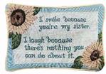 I Smile Because... Word Pillow that says: "I smile because you're my sister. I laugh because there's nothing you can do about it."