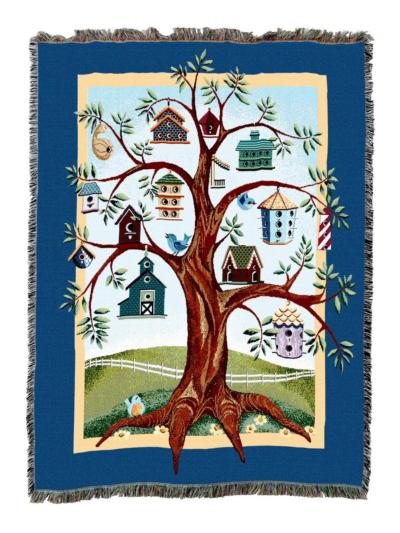 White Angel designed by © Bywaters is a gorgeous throw of an angel giving flowers to the doves. Cotton throws are 100% cotton, made in the USA. Tapestries make wonderful gifts.Family Birdhouse Tree Tapestry Throw