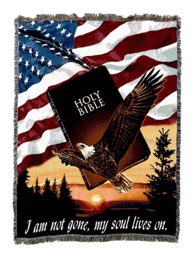 Memorial Honor I, features the setting sun with the American Flag, eagle and a cross with the last verse of taps, a tribute to a brave soldier. Bereavement throw blankets are 100% cotton, made in the USA. .