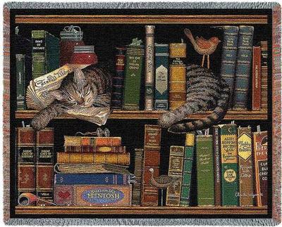 Frederick the Literate by © Charles Wysocki. Here's a cat that's taking a nap in the library. Wysocki cat designer throws, throw blankets, coverlets, and decorative tapestries are 100% cotton made in the USA.Frederick the Literate Tapestry Wall Hangins