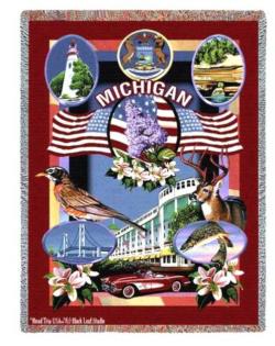 Michigan state throw is a colorful tapestry throw featuring landmarks, icons and more from your favorite state. Most state throw blankets are available. State throws, tapestries and blankets are 100% cotton, made in the USA.