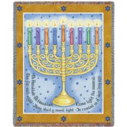 Chanukah-Eight Days, Judy Hand designed a menorah surrounded with Stars of David . Colorful candles and the words of the Hanukah Song decorate the menorah in light blue background. Woven Jewish Faith throw blankets are 100% cotton made in the USA. Judaism throws make wonderful gifts for the holidays.