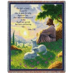 For God So Loved The World, John 3:16 Green Pastures - reads: "For God so loved the world, that he gave his only begotten Son, that whosoever believeth in him should not perish, but have everlasting life." Every coverlet and afghan with scripture make unique gifts. Scene with Jesus and lambs throws are 100% cotton, made in the USA. Give a gift of Love.